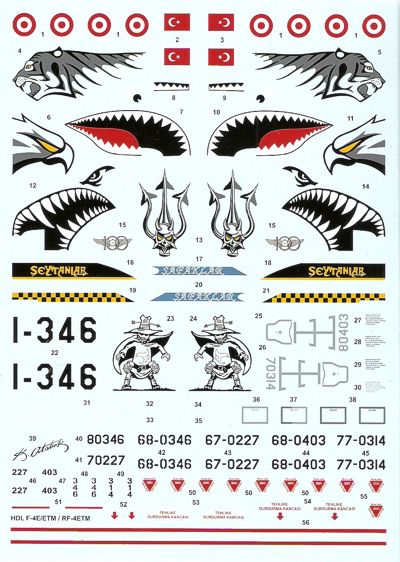 HI Decal - 1/72 McDonnell F-4E / F-4ETM / RF-4ETM Phantom II "Turkish Air Force" (4) 68-0346 F-4E Phantom II - 111 Filo "Panter", ex NJ ANG, with big "Tiger head" on the front fuselage,1993. 68-0403 F-4ETM Simsek - 112 Filo "Seytan", with big Sharkteeth and "Devil head" artwork on the tail , 2011. 67-0227 F-4E Phantom II - 172 Filo "Sahin", with Sharkteeth and big "Falcon head" artwork on the tail , 2010. These Phantoms all wear the Hill Grey II scheme . 77-0314 RF-4ETM Isik - 173 Filo "Safak", with big "Spook" artwork on the tail and new disruptive camouflage scheme.2012. This recce Phantom has been shot down by Syrian air defences above the East Mediterranean on June 22nd, 2012. The decal sheet also includes the respective Turkish stencil data. [+] More...