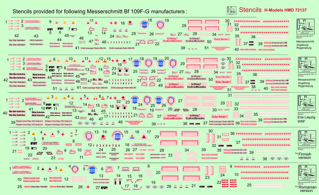 H-Model Decals - 1/72 Messerschmitt Bf-109F-2/Bf-109F-4/Bf-109G-1--Bf-109G-6 Stencils (sets for 3 different aircraft manufacturers+Finnish+Romanian)