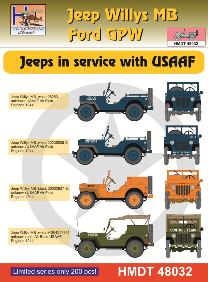 HM DECALS - 1/48 Decals Jeep Willys MB/Ford GPW in USAAF service