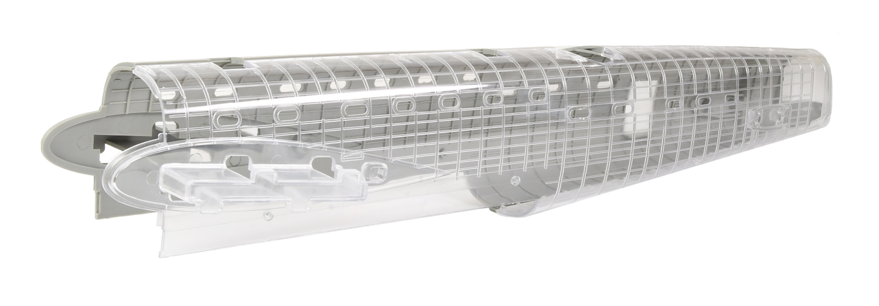 In production the fuselage and nose section will be injected without surface detail in crystal clear plastic first. The moulds will then be modified and surface detail added, an irreversible change meaning the clear version can never be produced again! Length 663mm,
