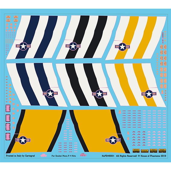 This sheet features 18 marking options, inlcuding all of the 'striped 'Candy Canes' and the 1976 Bi-centennial aircraft, plus stencils for two Phantoms. Decal designed for the Zoukei-Mura range of F-4.