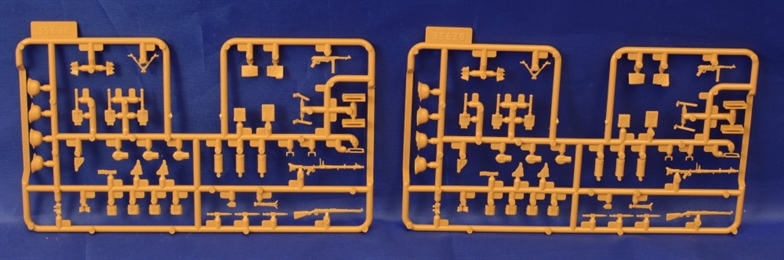 ICM - 1/35 WWII German Infantry Weapons & Equipment (100 new moulds). The set includes plastic kits of WWII German infantry weapons and equipment MG34 machine guns, ammunition boxes and tapes for the Mg 34, Mauser M98k rifles, MP40 submachine guns, ammunition pouches, Luger P08 and Walther P38 pistols in holsters, knife bayonets in scabbards, M36 steel helmets, respirator cases, binoculars and cases, officer bags, flashlights, small shovels, mess-tins, canteens