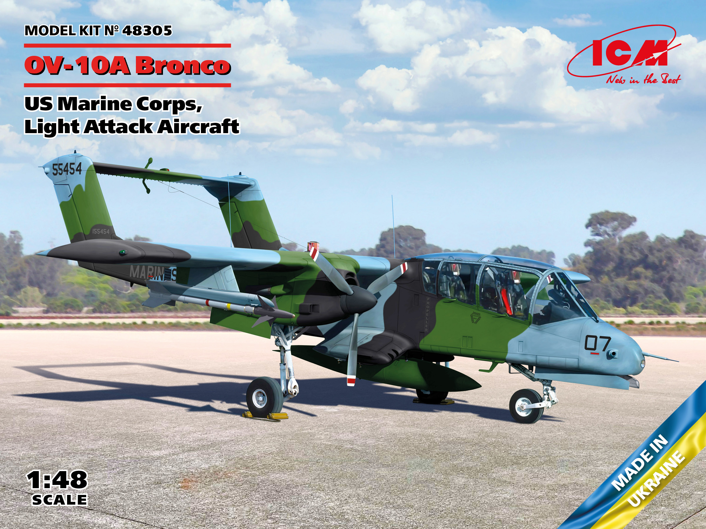 ICM - 1/48 North-American/Rockwell OV-10 Bronco US Marine Corps, Light Attack Aircraft The first prototype of OV-10A Bronco raised into the air in July 1965. After flight tests, the aircraft entered serial production. The US Air Force ordered 109 aircrafts, and the US Marine Corps another 76. After the war in Vietnam, the aircraft remained in service with aviation units and were modernized over time. The Marine Corps OV-10A received a digital threat warning system AN/APR-39, which monitors the surrounding environment for the presence of radar signals and warns the crew about dangerous sources of radiation. In addition, the AN/ALQ-144 Infrared Jammer 'Disco Light'and the AN/ALE-39 Counter Measure Dispenser System were installed on these aircraft. Aircrafts, equipped in this way, took part in the operation 'Desert Storm' in the winter of 1991. This operation was the last episode of combat use of the OV-10 Bronco aircraft in the US Marine Corps aviation, and in 1994 they were finally withdrawn from its combat composition.