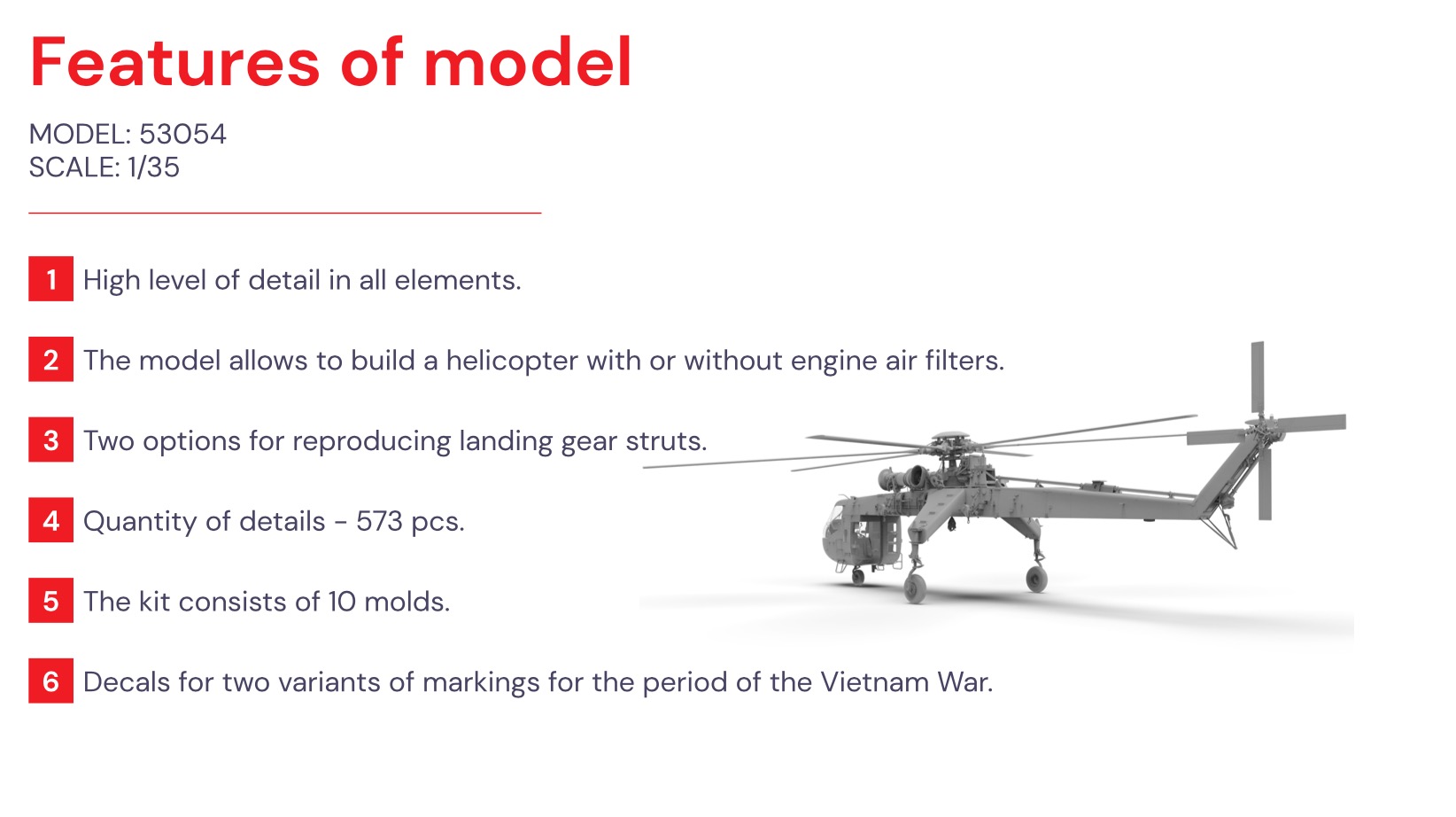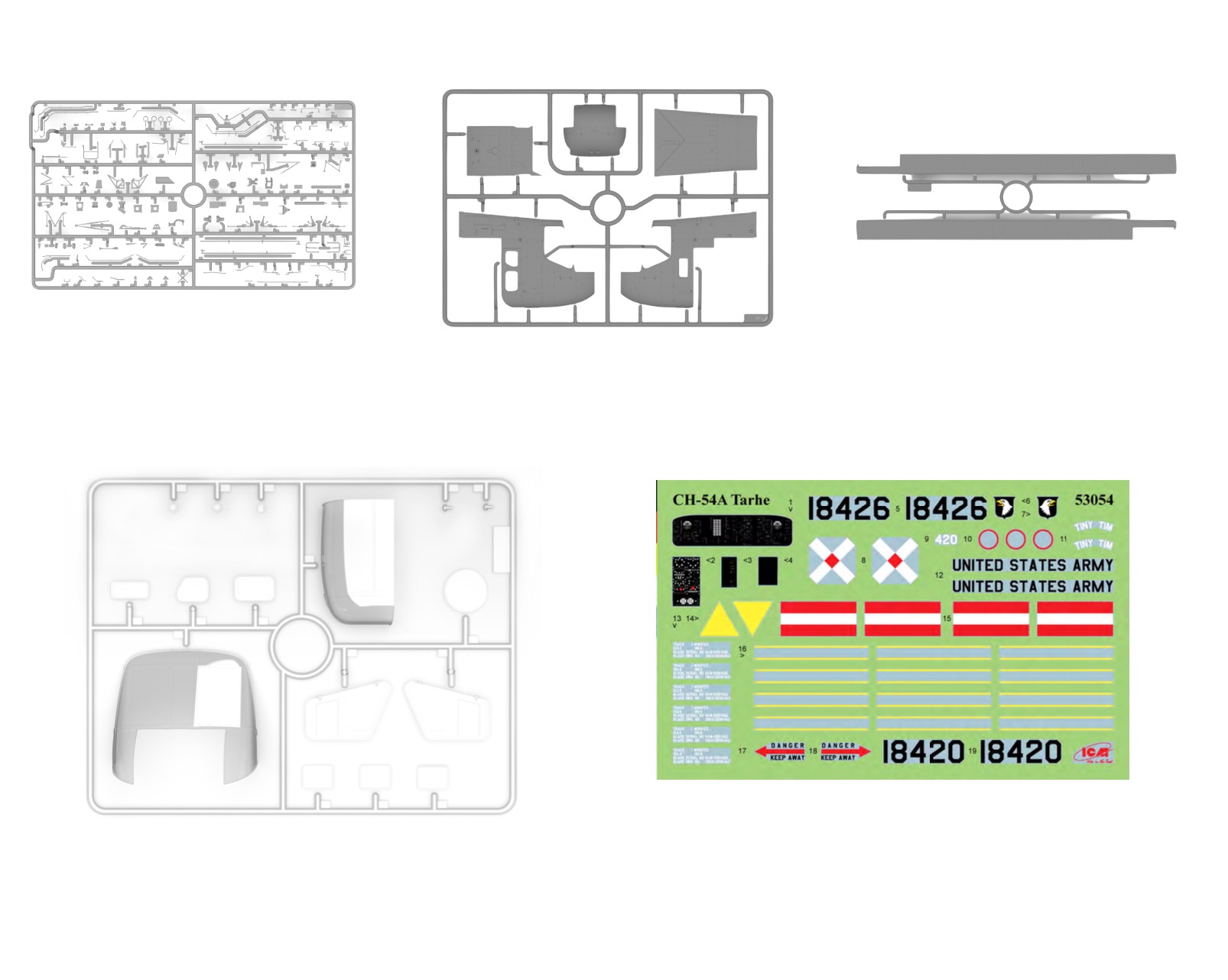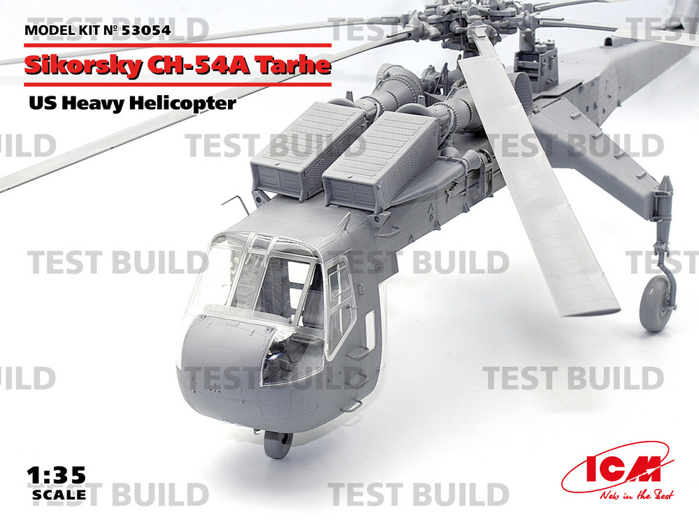 ICM - 1/35 Sikorsky CH-54A Tarhe US heavy helicopter. The CH-54 Tarhe helicopter was developed by Sikorsky Aircraft, a company founded by the prominent Ukrainian aircraft designer Igor Sikorsky. The first flight of the helicopter (originally named S-64) took place on May 9, 1962. The helicopter was built on a modular principle, which simplified its maintenance and repair. It had a tall three-post landing gear with a front support, which allowed a tractor with a trailer approach its fuselage freely. The helicopter's powerful winches allowed it to pick up cargo in a hover mode, without the need to land on the ground. During the Vietnam War it evacuated damaged airplanes and various helicopters, transported artillery pieces, cars, tanks and even combat boats on an external sling. It was also used to drop high-powered bombs to clear the forest for an airfield. This helicopter set 10 world records for its class, including lifting a 15-ton cargo to 3307 meters. The civilian version of the helicopter (Erickson S-64 Aircrane) is still in successful operation today.