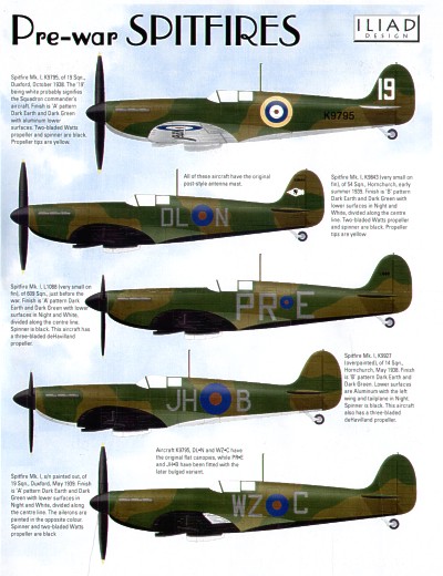 Iliad Design - 1/48 Pre-War Supermarine Spitfire Mk.I (5) K9795 19 Sqn Duxford 1938 2 blade prop, K9843 DL-N 54 Sqn Hornchurch 1939 2 blade prop, L1088 PR-E 609 Sqn 3 blade prop, K9927 JH-B 14 Sqn Hornchurch 1938 3 blade prop, 19 Sqn WZ-C Duxford 1939 2 blade prop.