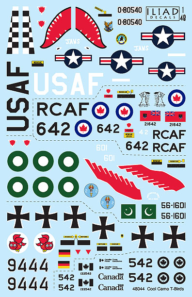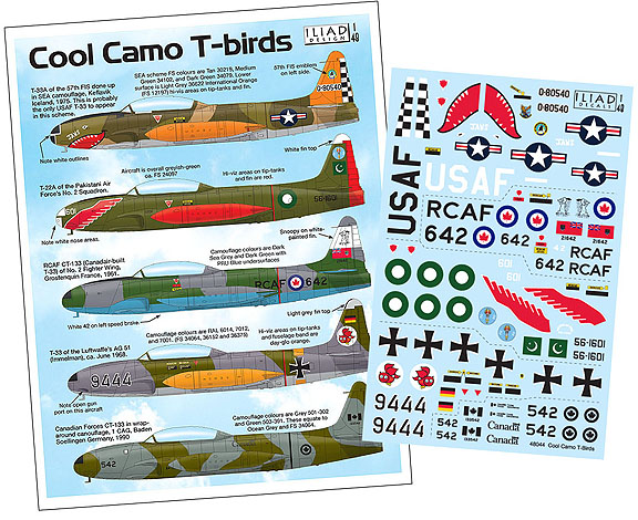 Iliad Design - 1/48 Cool Camo T-Birds. Here are some Lockheed T-33s in eye-catching schemes and very colourful markings. There's the 57th Fs 'JAWS' in Sea camouflage. There's a Pakistani bird in overall green came with a big red wing on the nose and red hi-viz markings. There's an Rcaf aircraft in post-war fighter colours of grey, green, And Pru blue, complete with a big Snoopy on a white-painted fin. There's a Luftwaffe aircraft with large nose numbers, Day-Glo hi-viz markings, and colourful unit crest on the fin. Finally there a Canadian Armed Forces bird in wrap-around camo and all-black markings. This sheet will be great for those who don't like doing natural metal finishes!