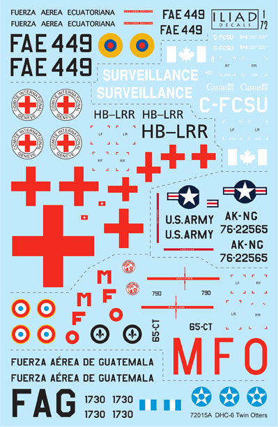 Iliad Design - 1/72 De-Havilland-Canada DHC-6 Twin Otters. Contains markings for the Ecuadorian Air force, Canada's Depart of Transport surveillance aircraft, US Army Alaska National Guard, Guatemalan Air Force, Committee of the Red Cross, and French Air Force.