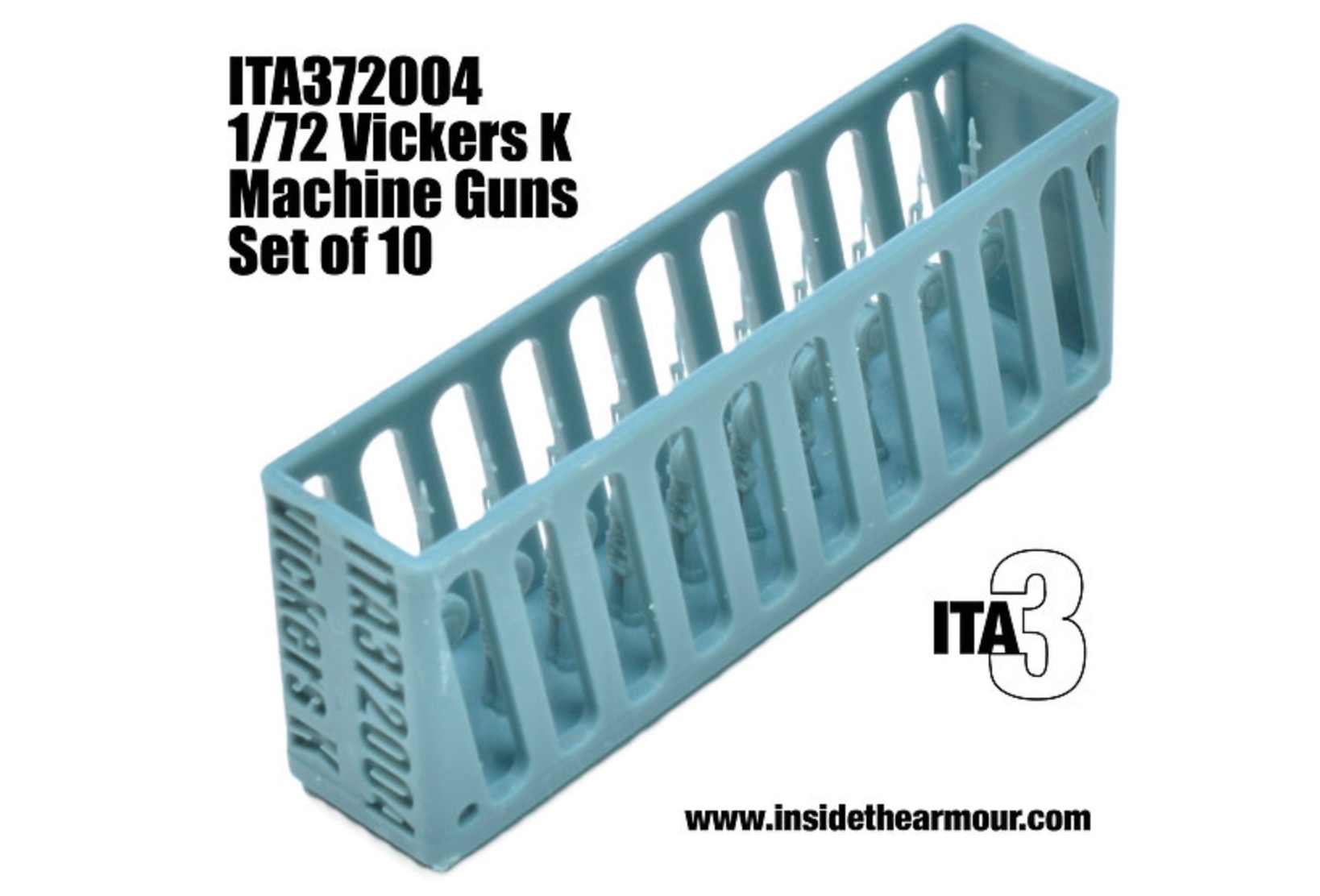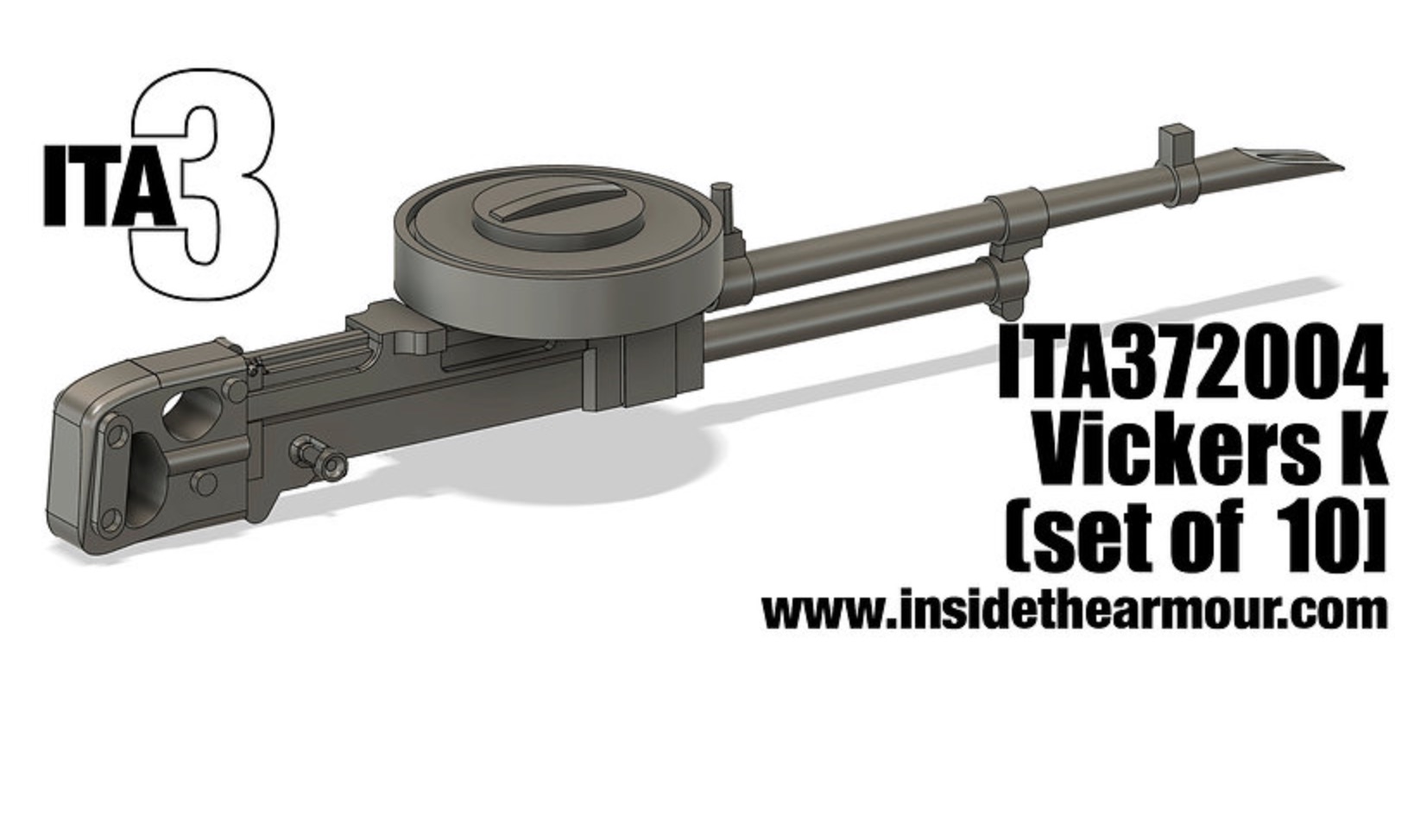 Inside the Armour - Vickers K 10 set 3d-printed a set of ten 1/72 vickers K guns commonly used on British aircraft. Hugely improved detail over kit items, easy to remove from the supports, and supplied in a pretectived printed box. As used on Raf Fairey Battle and Handle-Page Hampden. In gun turrets, such as the dorsal turret in the Bristol Blenheim, the nose turret in the Armstrong Whitworth Whitley and the rear of the cockpit in the Fairey Battle. It was the standard Royal Navy Fleet Air Arm 'Telegraphist Air Gunner' machine gun, on British built carrier Torpedo Strike Reconnaissance aircraft the Fairey Swordfish, the Fairey Albacore and the Fairey Barracuda. As supplies of air-cooled .303 in 7.7 mm Browning machine guns increased the Vickers G.O. was phased out of use with the RAF. These machine guns were then reallocated from Raf stocks to units of the British and Commonwealth armies. The gun continued in service with the Fleet Air Arm and its last recorded use by the navy was by 812 Squadron Rnas Barracudas in anti piracy patrols off Hong Kong in October 1945.