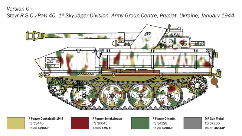 Italeri - 1/35 Steyr Rso Spg with PaK-40 Glueable Rubber Tracks, New Decals Sheet For 3 Versions Color Instruction SHEET