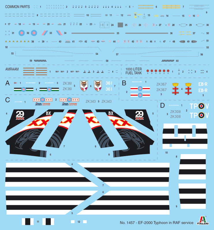 SUPER Decals Sheet For 4 Versions Colors Instructions Sheet Figure Not Included The Eurofighter project, developed from the second half of the 80s by a consortium of European companies, had the aim of realizing an advanced multi-role combat aircraft strongly specialized in interception. The result of the project is the Typhoon that is one of the best air superiority fighters in the world. Its aerodynamic design is characterized by canard-delta wings. Thanks to its two EuroJet EJ200 turbofan engines, the Typhoon can reach a maximum speed of Mach 2. The on-board technology, enhanced by fly-by-wire control system, allows to obtain a great maneuverability in air combat duties. The British Royal Air Force together with the air forces of Germany and Italy, is the main user of the Eurofighter, with 160 units deployed in the fighter squadrons.