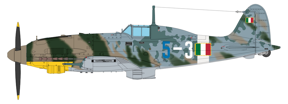 The Macchi M.C. 205 Veltro is considered the best Italian fighter of World War II. The evolution of the 'Folgore' retained the excellent aeronautical design of its predecessor and was equipped, like other fighters of the 'Series 5', with the German Daimler-Benz DB605 engine. The powerful V12 engine, also produced under license by Fiat, allowed the Veltro to reach a maximum speed of 640 km/h. Fast, maneuverable, and well-armed, with 2 x 12.7 mm machine guns in the nose and 2 x 20 mm cannons in the wings, it was capable of fighting on par with the best Allied fighters of the period, such as the American P-51 Mustang. It entered service with the Regia Aeronautica in the early months of 1943. After the armistice of September 8, it was used, until the end of the conflict, by both the flight units of the Italian Social Republic and those of the Co-Belligerent Air Force.