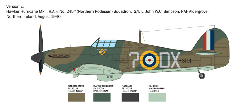 The Hawker Hurricane was the most widely produced and utilized fighter aircraft of the British Royal Air Force at the beginning of World War II. The Hurricane was powered by a Rolls-Royce Merlin 12-cylinder, liquid-cooled inline engine delivering over 1,000 HP, enabling it to reach speeds exceeding 500 km/h. Its armament of eight 7.7 mm Browning machine guns provided a solid firepower capability. Although it was slower and aerodynamically more outdated than its famous counterpart, the Supermarine Spitfire, with which it shared operational duties during the Battle of Britain, the Hurricane was more robust, cost-effective, and easier to maintain and repair. Additionally, it was simpler to fly, allowing for faster pilot training, which played a crucial role in securing victory during the Battle of Britain. Renowned Raf aces such as J. Johnson, W. Vale, and R. Stanford Tuck flew the Hurricane in combat.