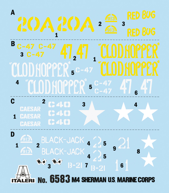 Italeri - 1/35 M4 Sherman U.S. Marine CORPS. New Gluable T54E1 Tracks Decals For 4 Versions Color Instructions SHEET