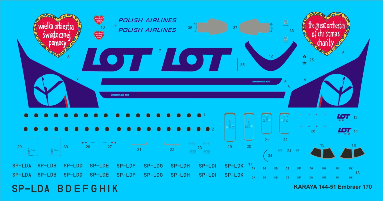 Karaya - 1/144 Embraer 170 Pll Lot early and special Wosp liveries plastic parts Hasegawa + silk/digital printed decals.