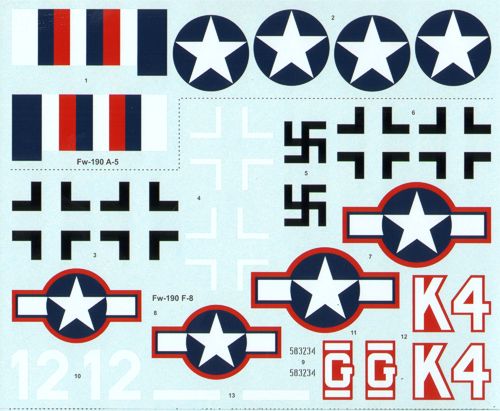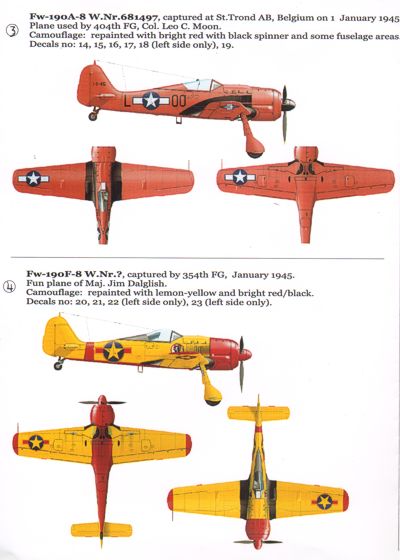 Karaya - 1/32 Captured Butcherbirds Part 5 (4) Focke-Wulf Fw-190A-5 325th Fg blue fuselage and wings, red nose and trim, Fw-190F-8 511th Fs K4-G sill in Luftwaffe camouflage, Fw-190A-8 L-OO captured at St Trond 1945 404th Fg Col Leo Moon overall red, Fw-190F-8 354th Fg Maj Jim Dalglish overall yellow with red nose and trim, All carry U.S. stars national insignia.