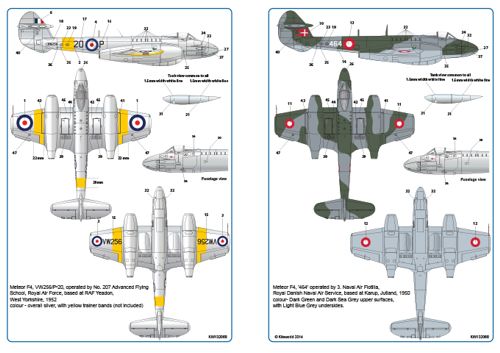 Gloster Meteor F4, VW256/P-20, operated by No. 207 Advanced Flying School, Royal Air Force, based at Raf Yeadon, West Yorkshire, 1952 overall silver, with yellow trainer bands (not included). Gloster Meteor F4, '464' operated by 3. Naval Air Flotilla, Royal Danish Naval Air Service, based at Karup, Jutland, 1950 Dark Green and Dark Sea Grey upper surfaces, with Light Blue Grey undersides.