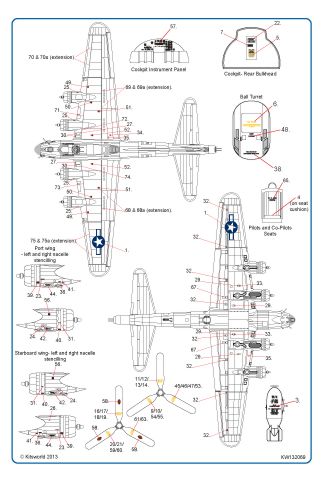 Kits-World - 1/32 Boeing B-17F/B-17G Flying Fortress Comprehensive General stencilling including Cockpit instrumentation, Fuel tank hatch info, Propeller logos, Black walkway lines, Life raft & data panels, Stars and Bars - and more!