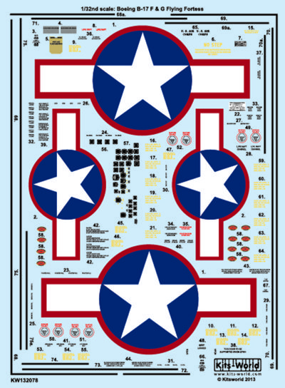 Kits-World - 1/32 Boeing B-17F/B-17G Flying Fortress Red Outlines Stars and Bars - Comprehensive General stencilling including Cockpit instrumentation, Fuel tank hatch info, Propeller logos, Black walkway lines, Life raft & data panel, Stars and Bars - and more!