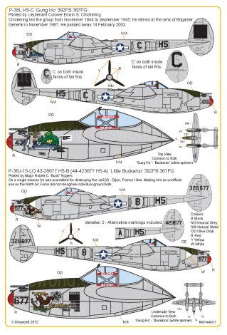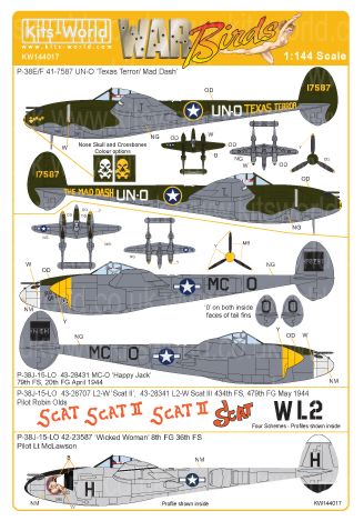 Kits-World - 1/144 Robin Olds P-38J-15-LO 43-28707 L2-W 'Scat II, 43-28341 L2-W Scat III 434th FS,479th FG May 1944 - P-38J-15-LO serial number 42-23587 'Wicked Woman' 8th FS 36th FG Pilot Lt McLawson - P-38J-15-LO 43-28431 MC-O 'Happy Jack' 79th FS, 20th FG April 1944 P-38E/F 41-7587 UN-O 'Texas Terror/Mad Dash Pilot Jack Ilfrey