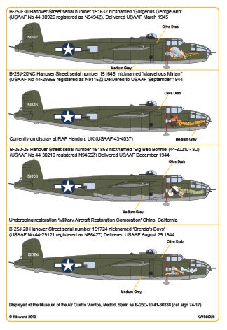 Kits-World - 1/144 Scale Hannover Street Mitchells North-American B-25J-30NC 151632 'Gorgeous George Ann/ There She Blows' N9494Z (USAAF No 44-30925) B-25J-20NC 151645 'Marvellous Miriam' N9115Z (USAAF No 44-29366) Hannover Street Mitchells B-25J-25 430210 8U 'Big Bad Bonnie' N9455Z (USAAF No 44-30210) B-25J-20 151724 'Brenda's Boys' N86427(USAAF No 44-29121)