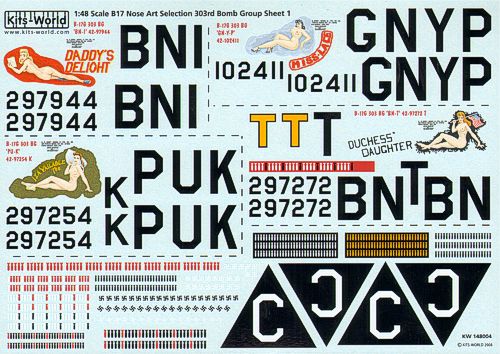Kits-World - 1/48 Boeing B-17G Flying Fortress Nose Art of the 303rd Bg (4) BN-I Daddy s Delight , GN-YP Miss Lace , UK-P Iza Vailable Too , BN-T Duchess Daughter . Individual aircraft markings only, all overall natural metal.