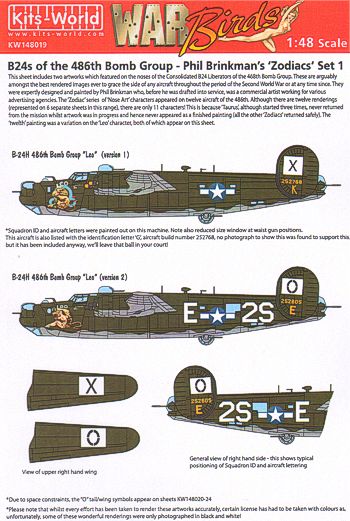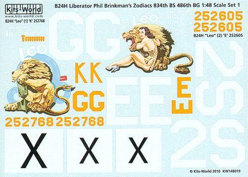 Kits-World - 1/48 Consolidated B-24H Liberator 834th BS, 486th Bg Phil Brinkman s Zodiacs Set 1 (2) 252788 K Leo version 1, 252805 2S-E Leo version 2. Individual aircraft markings only