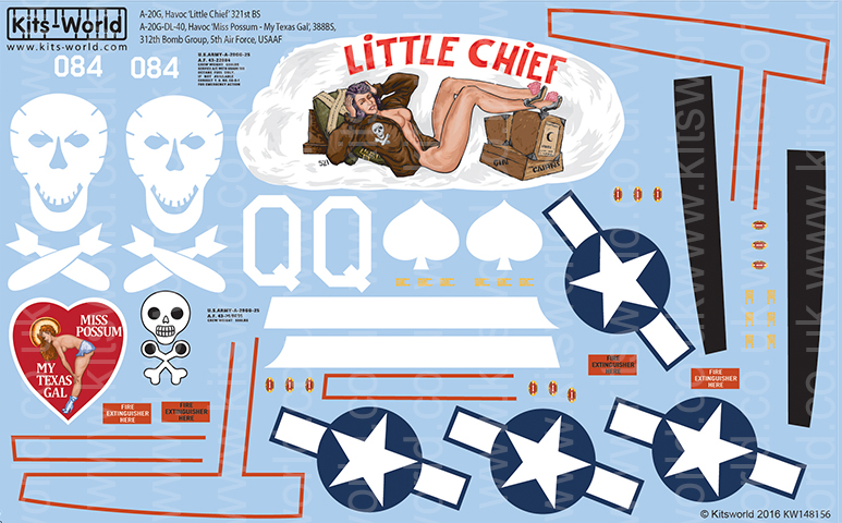 Kits-World - 1/48 Douglas A-20 Havocs. A-20G, Havoc 'Little Chief' 321st BS - A-20G-DL-40, Havoc 'Miss Possum My Texas Gal', 388BS, 312th Bomb Group, 5th Air Force, USAAF.