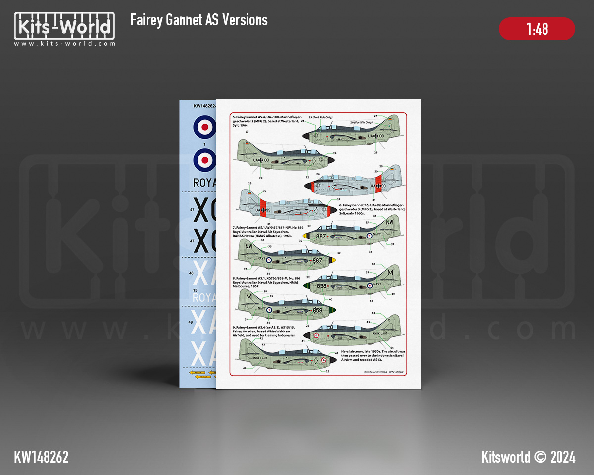 Fairey Gannet AS.4 ex-AS.1, AS15/15, Fairey Aviation, based White Waltham Airfield, and used for training Indonesian Naval aircrews, late 1950s. The aircraft was then passed over to the Indonesian Naval Air Arm and recoded AS13. 2 x A5 decal sheet set.