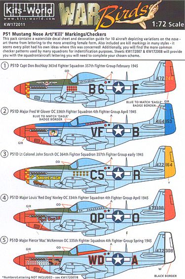 Kits-World - 1/72 North-American P-51D Mustang Nose Art, Kill Markings, Nose Checks Pt 1. 'Shillelagh', Happy Jack's Go Buggy', 'Red Dog XII', 'Pin Up Girl' 'Heat Wave', 'Ridge Runner', 'Missouri Mauler', Individual aircraft markings only.