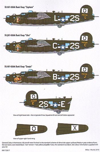 Kits-World - 1/72 Consolidated B-24H Liberator 834th BS, 486th Bg Phil Brinkman s Zodiacs Set 1 (6) 252788 K Leo version 1, 252805 2S-E Leo version 2, 252490 2S-D Gemini , 252744 2S-L Capricorn , 252508 2S-C Libra , 252762 2S-B 'Cancer'. Individual aircraft markings only.