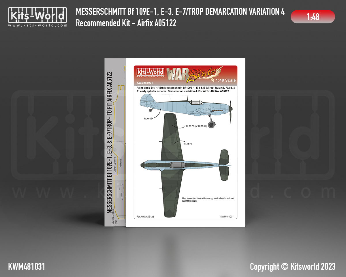 Kits-World - 1/48 Messerschmitt Bf-109E-1, Bf-109E-3, Bf-109E-7 Rlm 65, 70, 71 or 02 Splinter Scheme, Variation 4 (for Airfix AX05122 kits) .