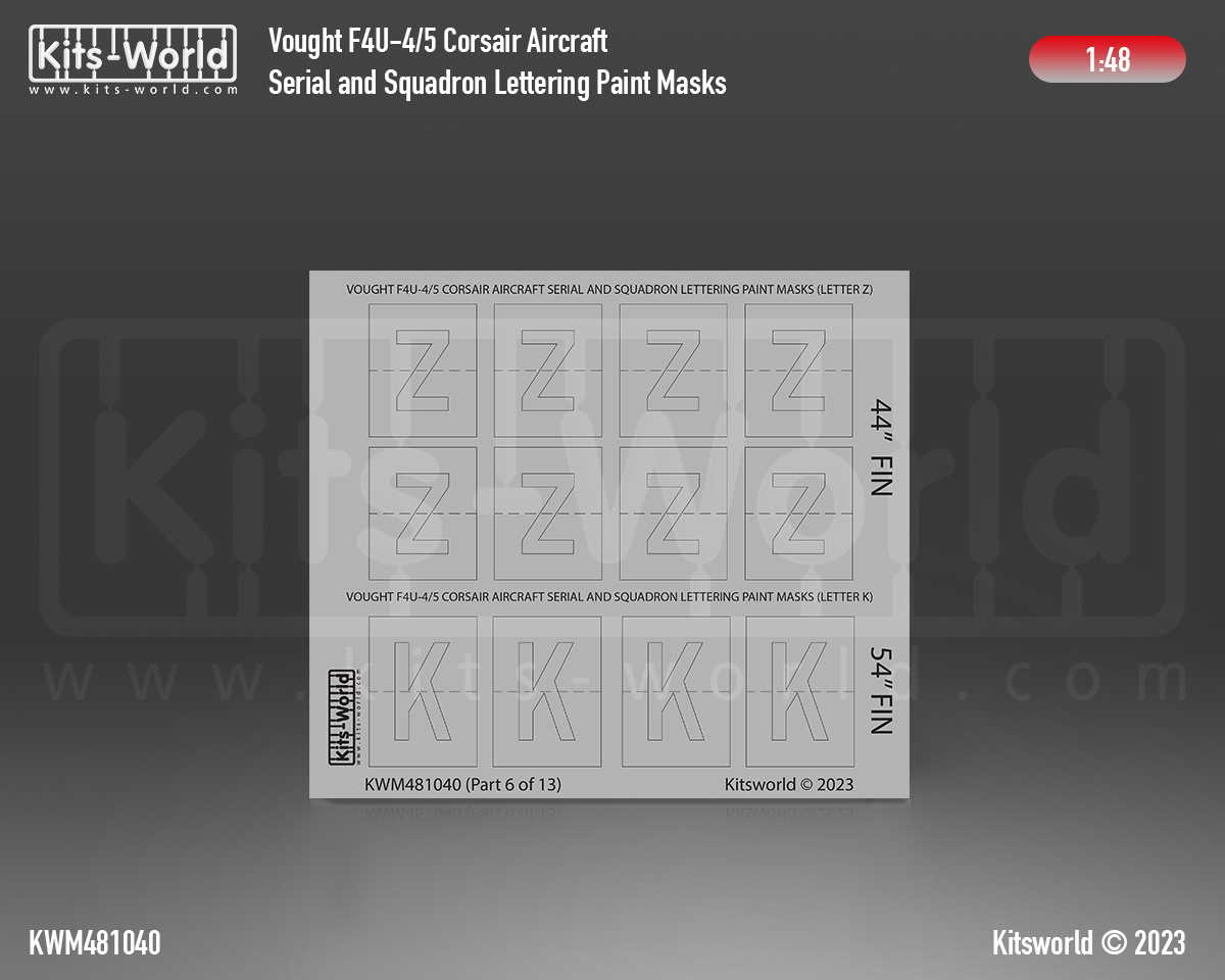 Kits-World - 1/48 Vought F4U-4/5 Corsair Serial and Squadron Lettering Paint Mask (14 piece set including decal sheet).