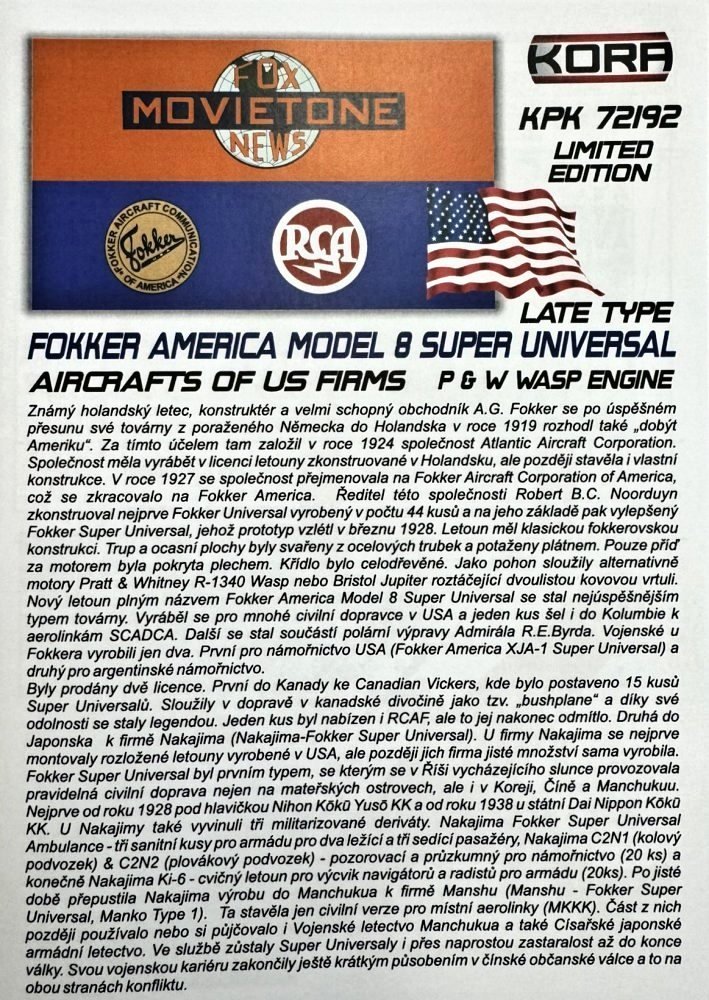 KORA MODEL - 1/72 Fokker America Model 8 Super Universal US Firms