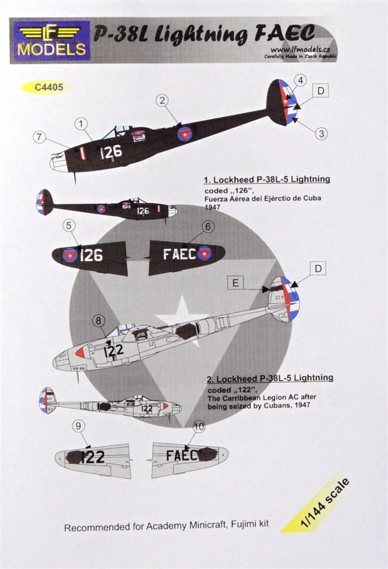 LF Model - 1/144 Lockheed P-38L Lightning FAEC CUBA 1947 (2 decal options) for Academy, Fujimi and Minicraft kits)