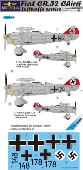 LF Model - 1/48 Fiat CR.32 Chirri Luftwaffe Service. 2 Decal Options for Special Hobby and Classic Airframes kits.