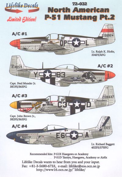 Lifelike - 1/72 North-American P-51B/P-51D Mustang A/C #1--P-51B, QP-L, "Salem Representative" of Lt. Ralph K. Hofer, 4FG/334FS A/C #2--P-51D, B3-Y, "Skyczar" of Capt. Fred Munder Jr., 363FG/381FS A/C #3--P-51B, C3-D, "BogMac Junior" of Capt. John Brown, 363FG/382FS A/C #4--P-51D, E6-A, "Nancy Lee" of Lt. Richard Baggett, 370FG/402FS (