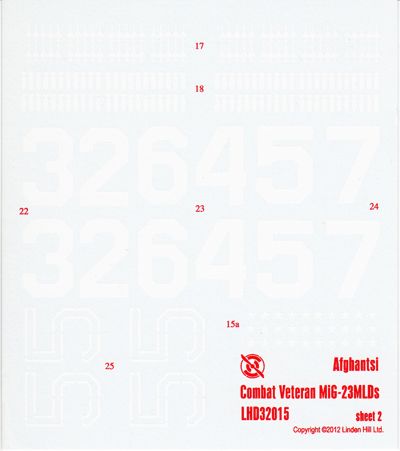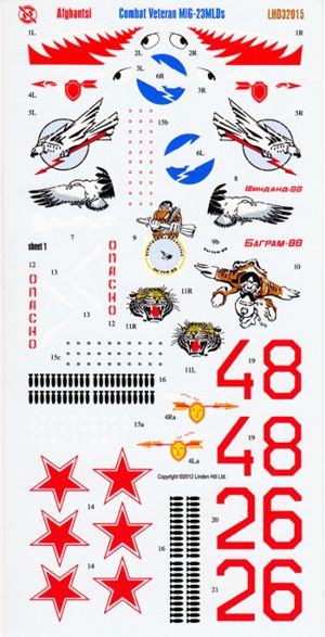 Linden Hill - 1/32 Mikoyan MiG-23MLD. Mikoyan MiG-23MLD 'Afgantsi' is the culmination of over a decade of research into the VVS Mikoyan MiG-23 'Lightweights' which served in Afghanistan between 1984 and January 1989. The set includes a richly illustrated six-page booklet, which includes both individual histories of the MLDs featured and numerous rare reference photos. The decal set is designed to complement the forthcoming Aviaeology book 'Griffons over Afghanistan' MiG-23MLD Soviet in Afghanistan (6) Red 48 Bagram 1988; Red 26 1987; White outline 55 Kandahar 187; White 32 1988; White 57 1988; White 64 shark mouth 1988;