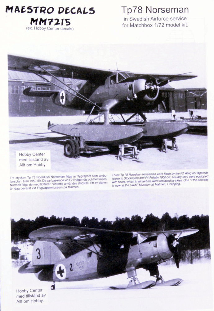 MAESTRO MODEL - 1/72 Decals Tp78 Norseman in Swedish AF (MATCHBOX)