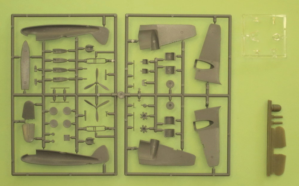 This injection-moulded kit contains 51 parts, 5 resin parts and six clear parts (cockpit canopies, position lights etc.). A comprehensive instruction leaflet and a decal sheet are included. The rear side of the box comprises the representation of a tarmac section of the airfield which can be cut out and used as a display base for the assembled model.