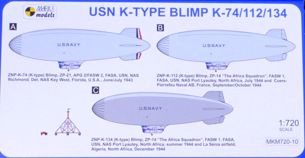 Mark I Models - 1/720 K-type Blimp (K-74/112/134) 'Fleet Defender' Non-rigid airships (or blimps) were the first types of lighter-than-air craft. Since the turn of the 20th century, they have been employed on a large scale by armed forces and also engaged commercially.