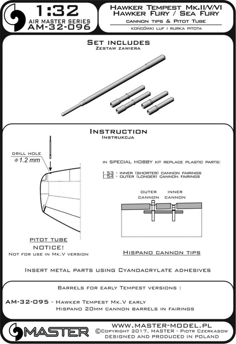 Master (PL) - 1/32 Hawker Tempest Mk.II/Mk.V/Mk.VI and Hawker Fury/Sea Fury - Hispano Mk.V cannon barrel tips and Pitot Tube (for Special Hobby kits)