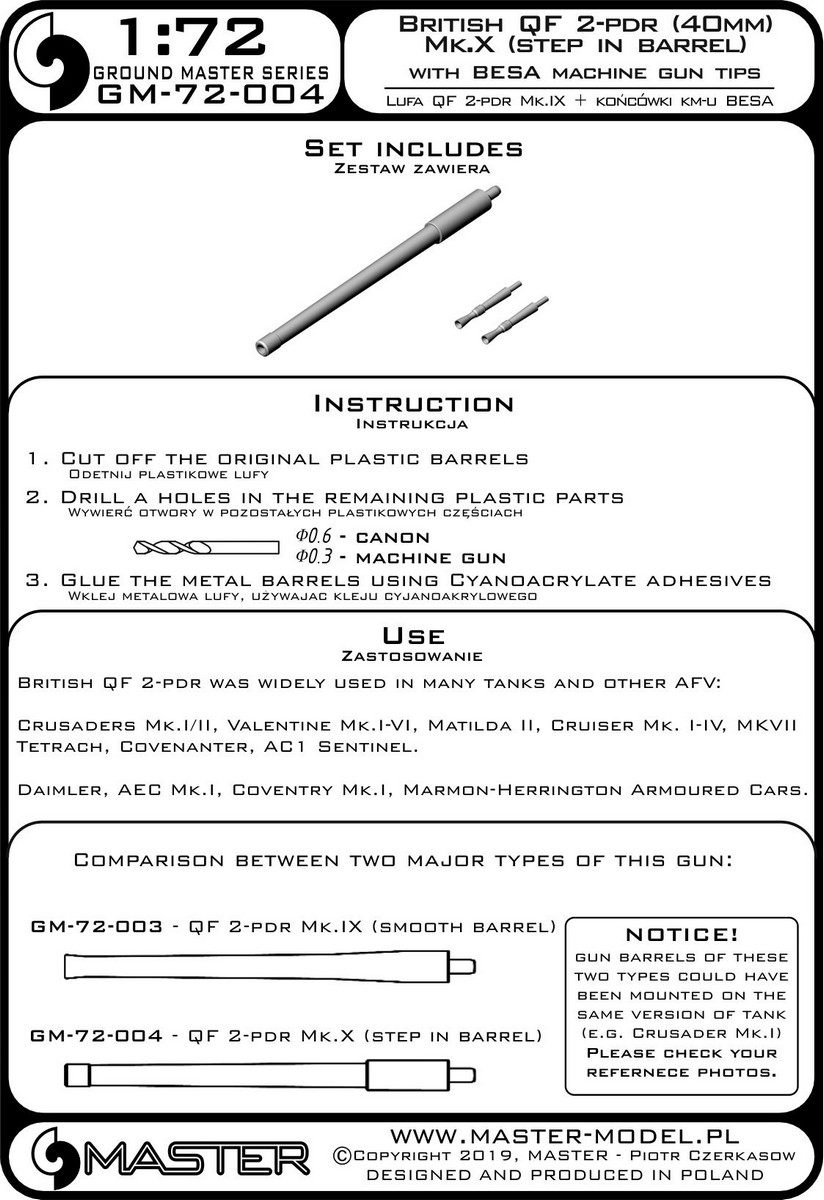Master (PL) - 1/72 British Qf 2-pdr (40mm) version Mk.X (step in barrel) + Besa Mg tips for Crusader Mk.I/Mk.II, Valentine, Matilda II, and other Afv (for Ibg kits)
