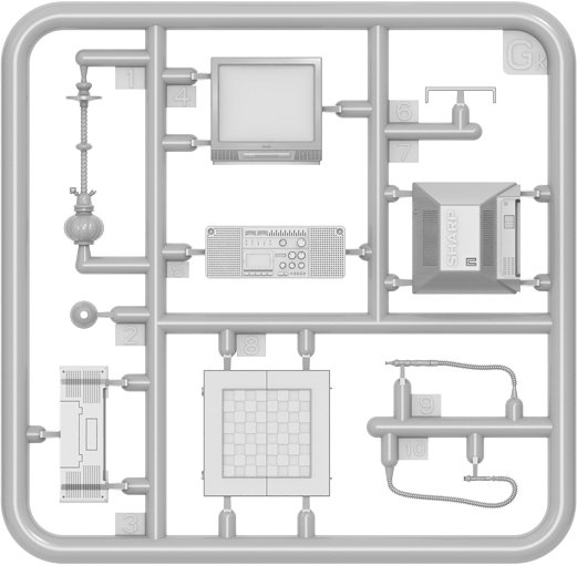 Miniart - 1/35 Street furniture with electronics & umbrella highly detailed plastic model kit. kit contains models of: TV, Radio, Hookah, Backgammon, Wooden Table, Kettles, Tray, Clay Decanter, Cups, Street Umbrella, Plastic Chairs and Tables.