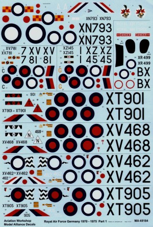 Model Alliance - 1/48 Raf Germany during 1970's. Was 15.35. Temporarily Save 1/3RD!!! BAC/EE Lightning F.2A XN793 / A of 92 Squadron, based at Raf Guu ttersloh, West Germany, in 1972. Flown by the unit CO, W/Cdr. J.B. Mitchell. BAe Harrier GR.1 XV781 / C of 4 Squadron, based at Raf Wildenrath, West Germany, in 1971. BAe Harrier T.2 XZ145 / T of 3 Squadron, based at Raf Wildenrath, West Germany, in 1976. Westland Wessex HC.2 XR499 / Bx of 18 Squadron, based at Raf Gutersloh, West Germany, in 1974. McDonnell-Douglas FGR.2 Phantom XT901 of 2(AC) Squadron, based at Raf Laarbruch, West Germany, in 1974. McDonnell-Douglas FGR.2 Phantom XV468 of 2(AC) Squadron, based at Raf Laarbruch, West Germany, in 1975. Zaps on both intake splitter plates and with unusually proportioned underwing roundels. McDonnell-Douglas FGR.2 Phantom XV462 of 17 Squadron, based at Raf Bruggen, West Germany, in 1972. McDonnell-Douglas FGR.2 Phantom XT905 of 17 Squadron, based at Raf Bruggen, West Germany, in 1975.