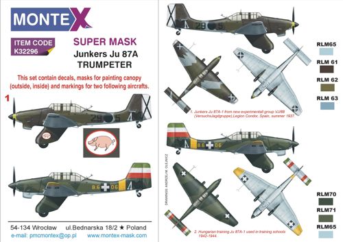 Montex - 1/32 Junkers Ju 87A 'Stuka' 2 canopy mask (outside & inside) + 2 insignia masks + decals (designed to be used with Trumpeter kits)