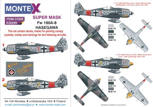 Montex - 1/32 Focke-Wulf Fw 190A-8 2 canopy mask (outside & inside) + 2 insignia masks + decals (designed to be used with Hasegawa kits)