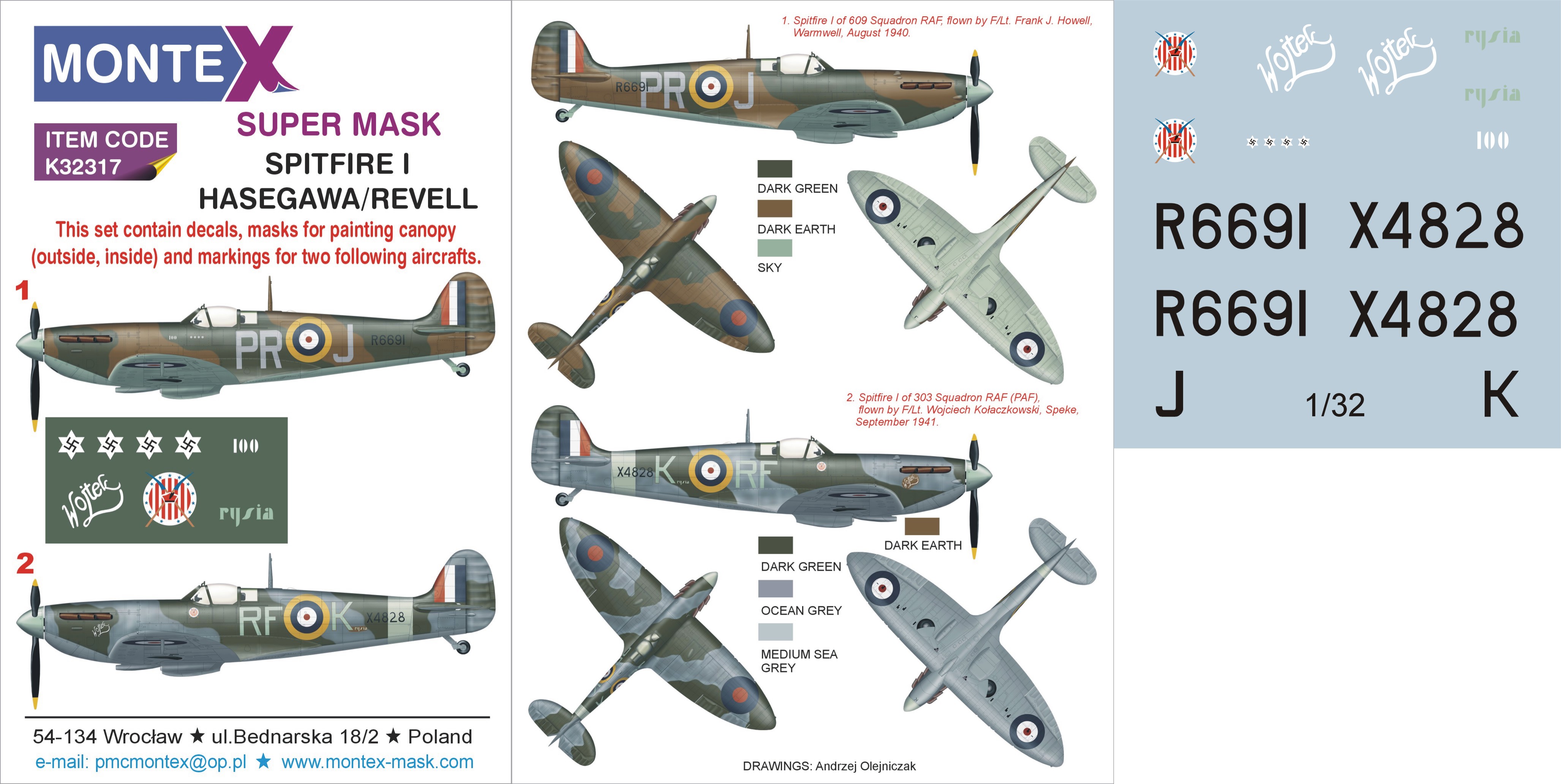 Montex - 1/32 Supermarine Spitfire Mk.I (for Hasegawa and Revell kits) 2 canopy masks (outside and inside canopy masks) + 2 insignia masks + decals
