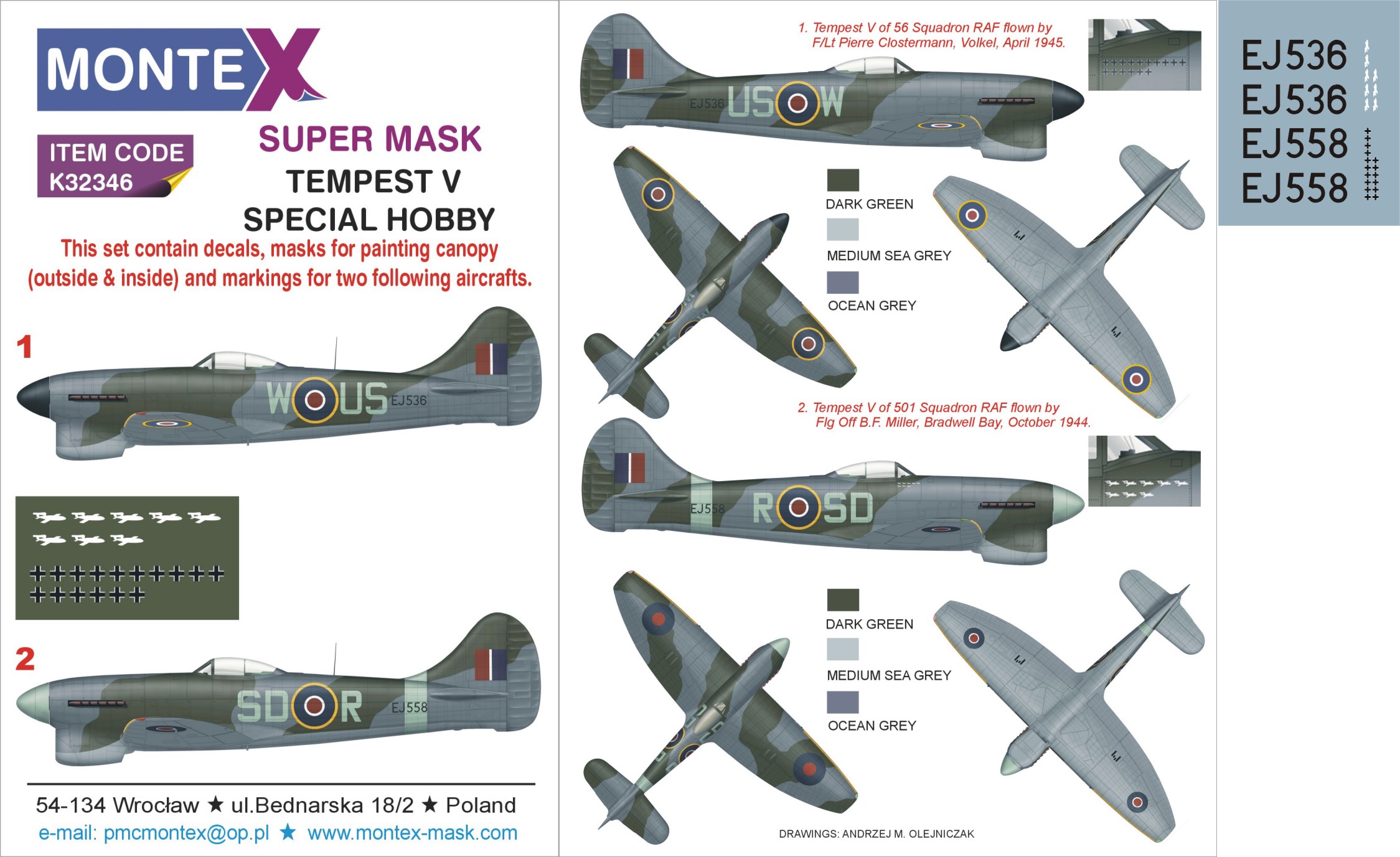 Montex - 1/32 Hawker Tempest Mk.V 2 canopy mask (outside & inside) + 2 insignia masks + decals (for Special Hobby kits)