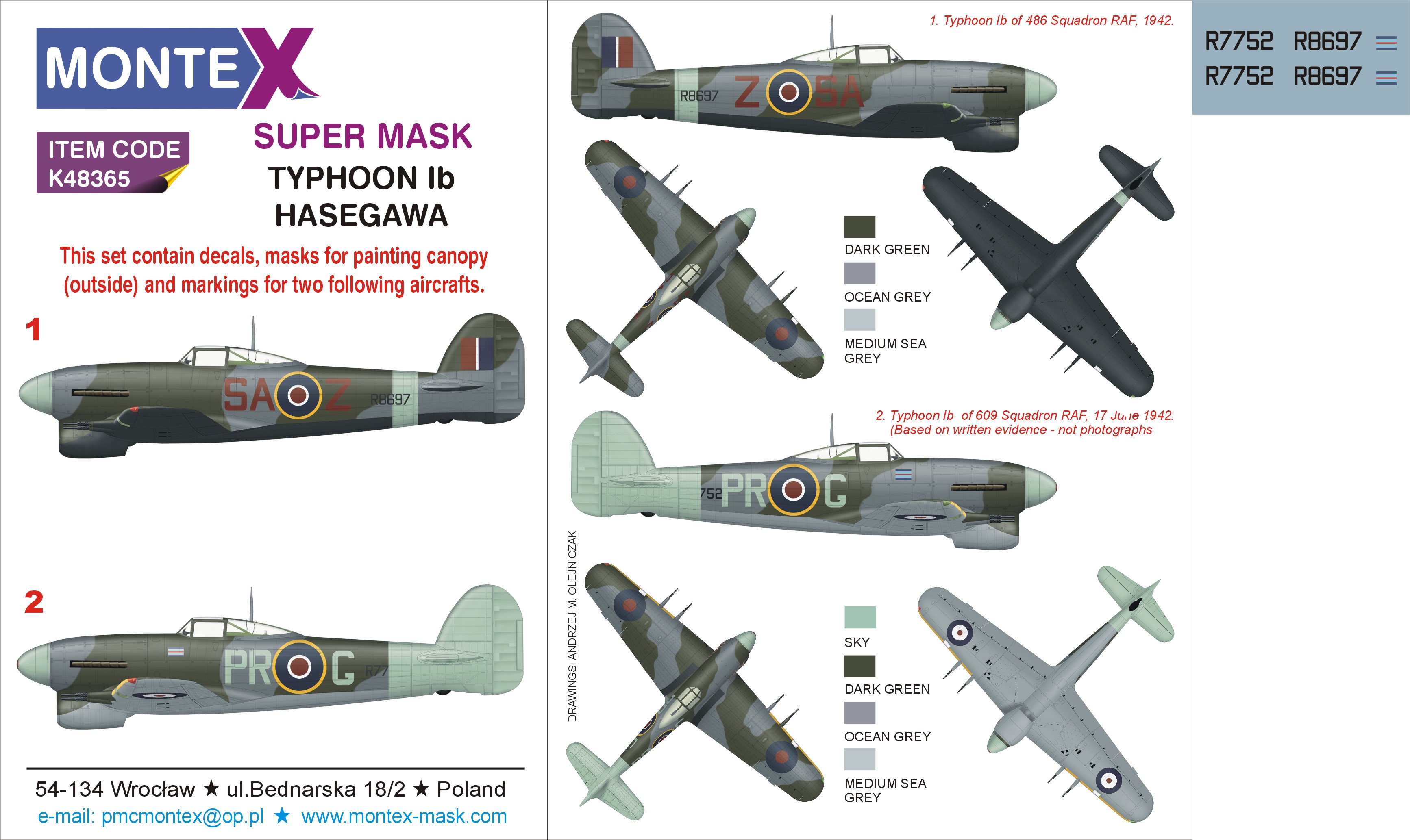 Montex - 1/48 Hawker Typhoon Mk.IB 1 canopy mask (outside) + 1 insignia masks + decals (for Hasegawa kits)