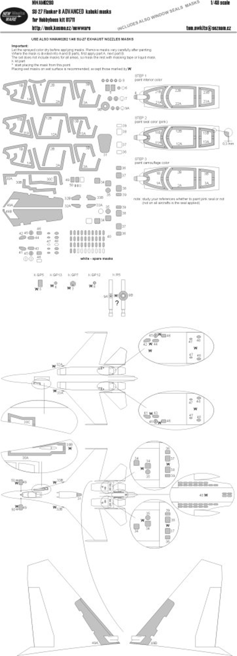 New Ware - 1/48 Sukhoi Su-27 Flanker B ADVANCED kabuki masks canopy including seals masks, other clear parts and lights, surface panels and other camouflage details (for Hobby Boss HB81711 kits)